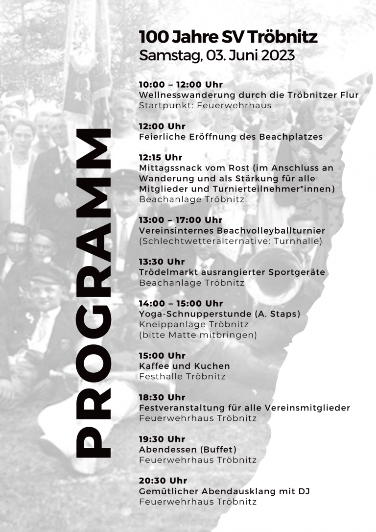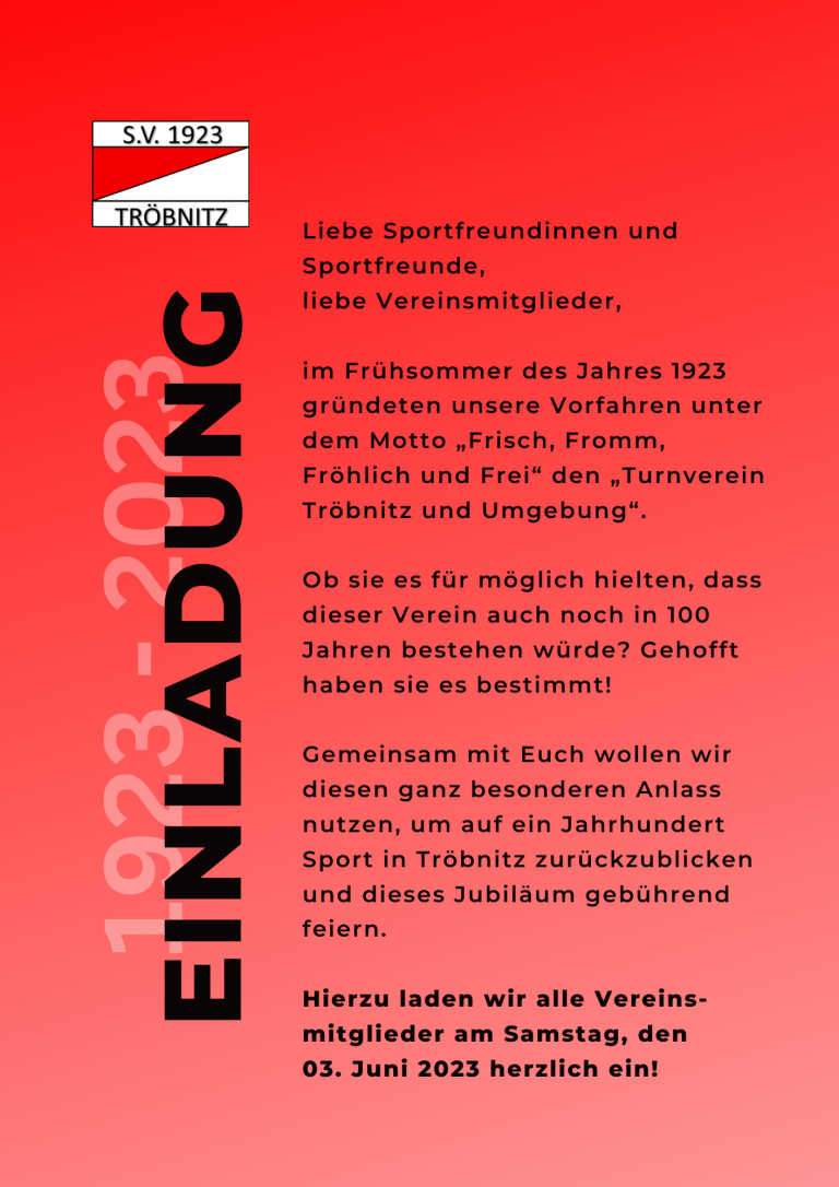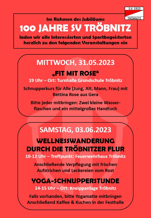 Der Sportverein Tröbnitz 1923 feiert am 03.06.2023 sein 100-jähriges Bestehen. Neben jede Menge sportlichen Aktivitäten findet abends eine Festveranstaltung mit Dia-Vortrag, Festrede sowie anschließend Disco und Tanz statt. Während der Festveranstaltung werden Christa Fischer (Turnen), Gudrun Putze (Turnen) sowie Ulrich Rösel (Volleyball) als Ehrenmitglieder des Vereins ausgezeichnet. Zudem wird die Tröbnitzer Herrenmannschaft in der Saison 2022/23 Meister in der Bezirksliga Ost. Bei dem Jubiläum „800 Jahre Tröbnitz“ (01.-03.09.2023) beteiligt sich der Sportverein unter anderem mit einer Tanzeinlage der Gymnastikfrauen, einer Sportolympiade für alle Altersgruppen sowie einem Volleyball-ABC für Groß und Klein.