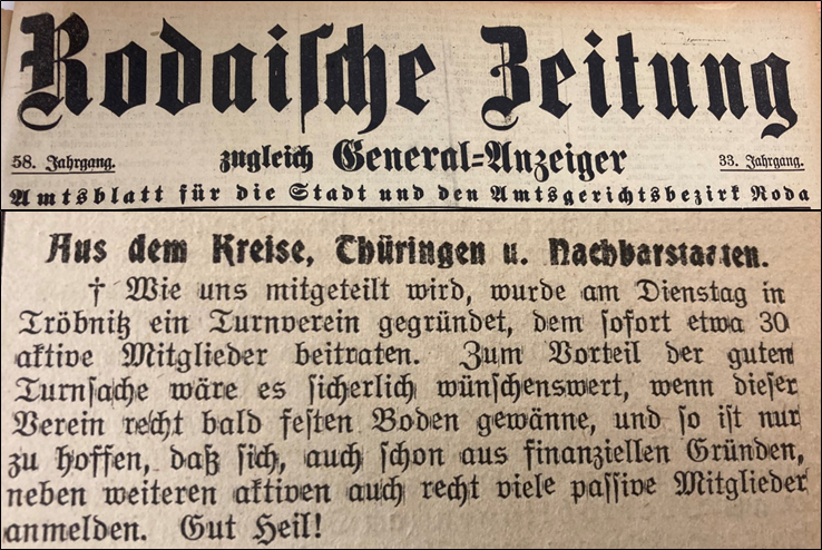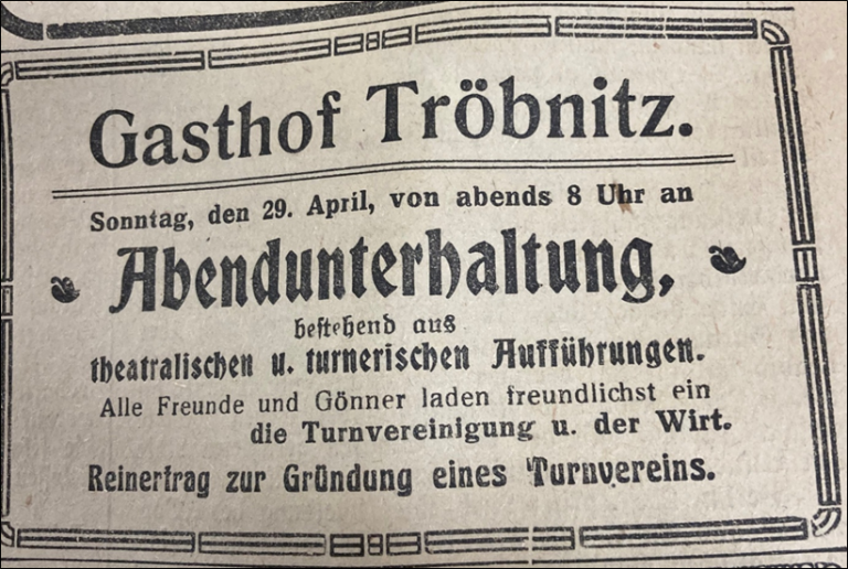 Der „Turnverein Tröbnitz und Umgebung“ nahm am 14. Deutschen Turnfest in Köln teil. Anlässlich des 5. Vereinsjubiläums wurde die Vereinsfahne feierlich geweiht. Nachdem die Fahne in den Wirren des Zweiten Weltkrieges in Vergessenheit geriet, entdeckte man sie in den 1960er-Jahren auf dem Boden des Tröbnitzer Gasthaus zum Mohr wieder.